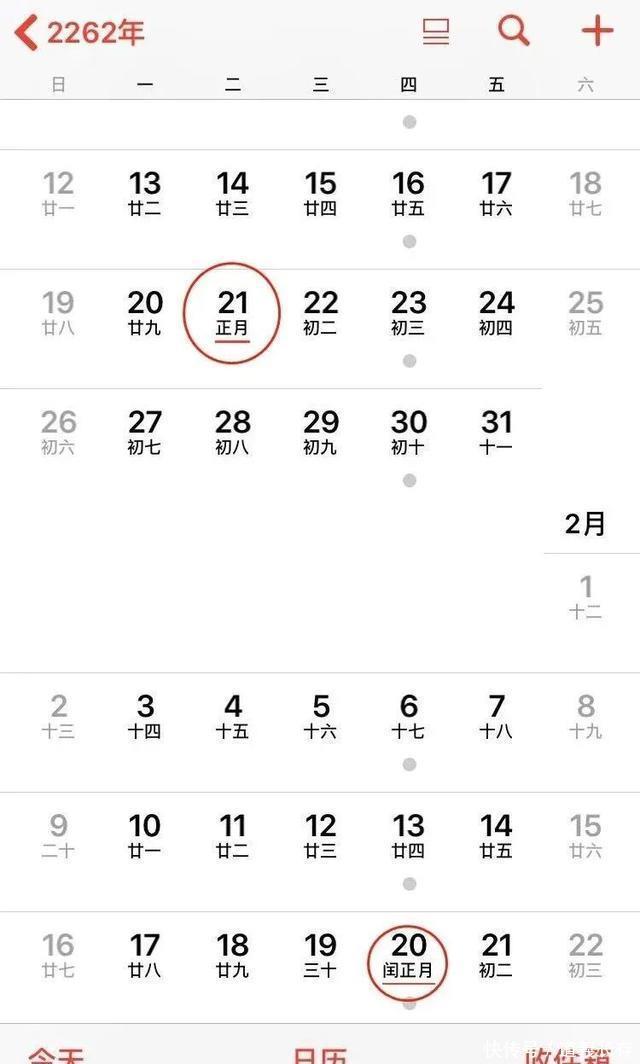 你知谈吗? 2262年有两个春节! 把柄万年历查询 2262年1月21日 是农历正月月朔 (第一个春节) 2月20日是闰正月月朔 (第二个春节) 这种闰正月时事非凡萧瑟!