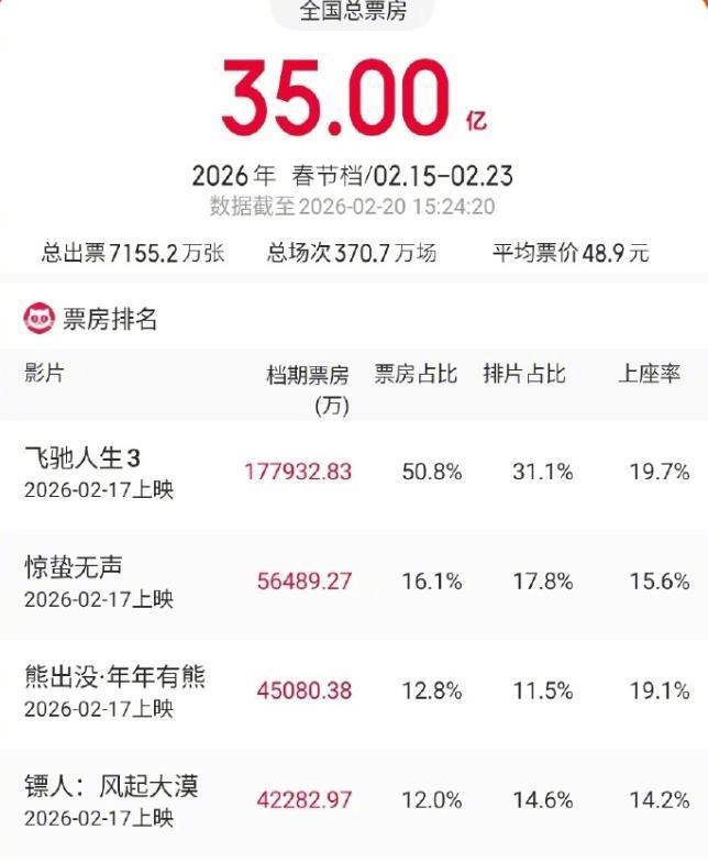 适度于2月20日,春节档票房还是破碎35亿,《飞奔东说念主生3》的票房破碎17亿,占比快要百分之五十,这么的情况出现,许多网友皆以为《飞奔东说念主生3》提前锁定春节档票房冠军。