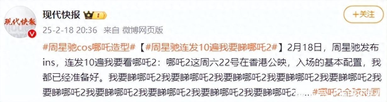 据当代快报,2月18日,周星驰在外交平台连发10遍“我要看《哪吒2》”:“我要睇哪吒2我要睇哪吒2我要睇哪吒2我要睇哪吒2我要睇哪吒2我要睇哪吒2我要睇哪吒2我要睇哪吒2我要睇哪吒2我要睇哪吒2……”