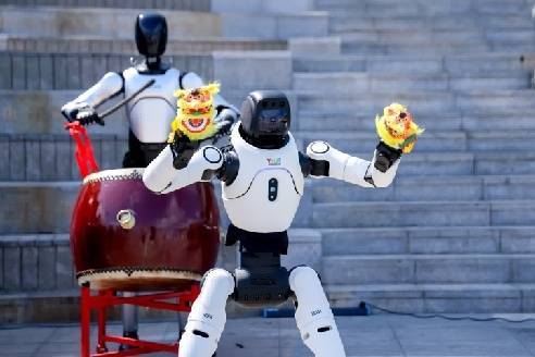 机器东说念主舞狮与传统饱读乐同台。第六届亚洲沙滩招引会组委会供图