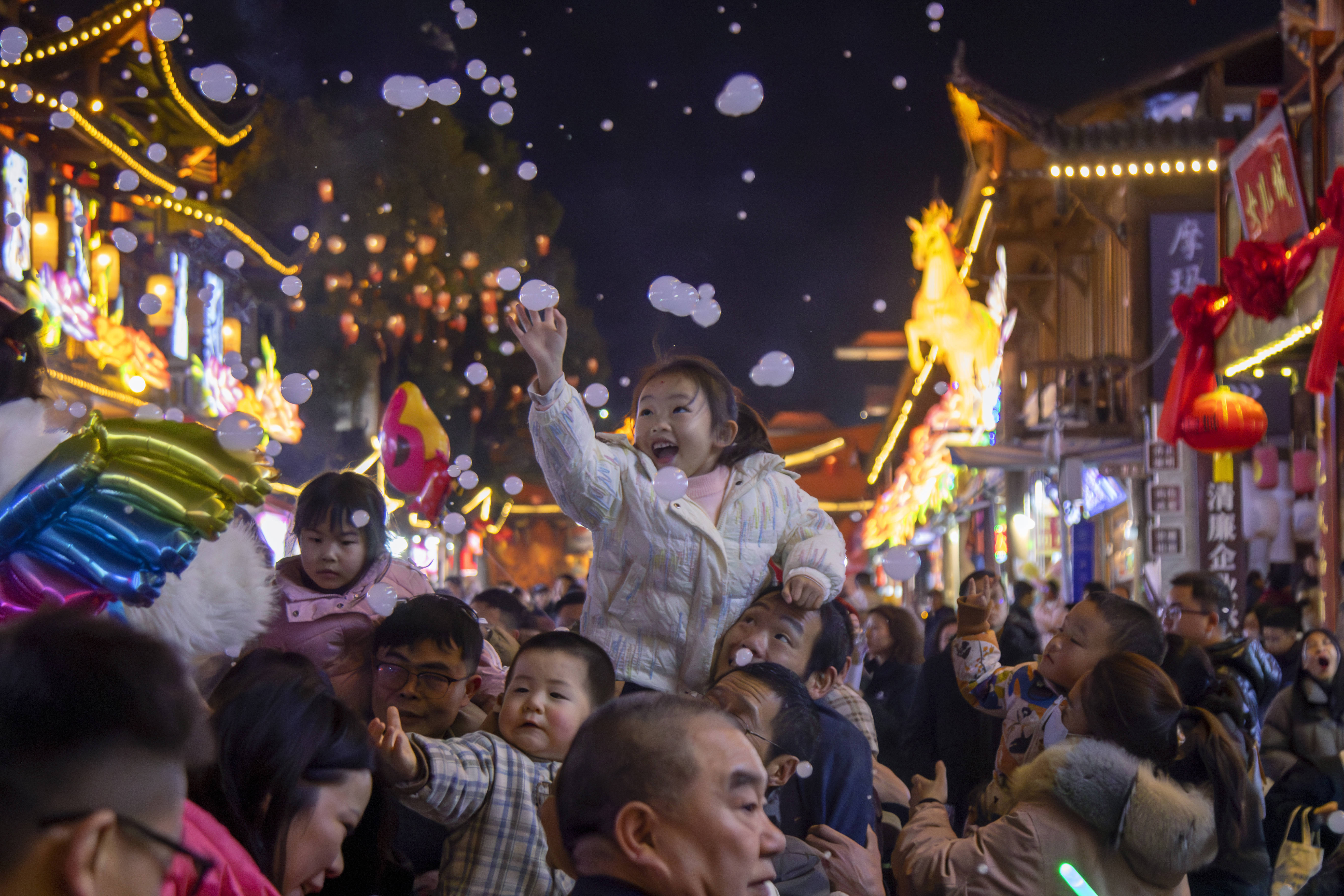 2026年春节前夜,旅客在湖北省宣恩县城贡水河上乘坐“龙游贡水”竹筏赏夜景(无东说念主机像片)。新华社发(宋文 摄)在江西南昌,万寿宫历史文化街区将老城肌理与贩子人烟玄妙和会。青石板路两侧,老字号小吃与文创店铺毗邻共生,腹地东说念主的早餐摊与旅客的打卡点无缝链接,市民和旅客一同逛市集、品年味、闹新春。