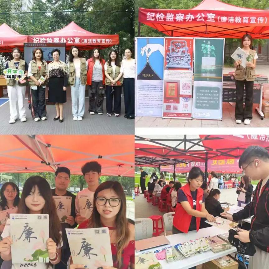 三个校区迎新现场扶直廉正书签、文献夹,选拔视频及展板等形势进行廉正文化作品展。