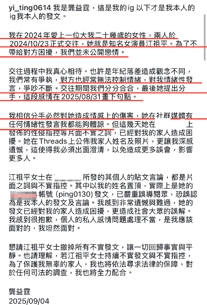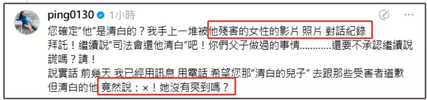 江祖平看后不慌不忙的不竭复兴,先是发布了不自裁声明,接着刺破龚益霆真面庞,示意他是自恋东谈主格,我方从未被慈悲对待,告诉对方我方一定会伸张正义,还强调无论刑事或民事诉讼,齐会提告索赔性侵金额约1300万台币(300万东谈主民币),还同意会捐给动物之家,平直骂龚益霆是狗值得。