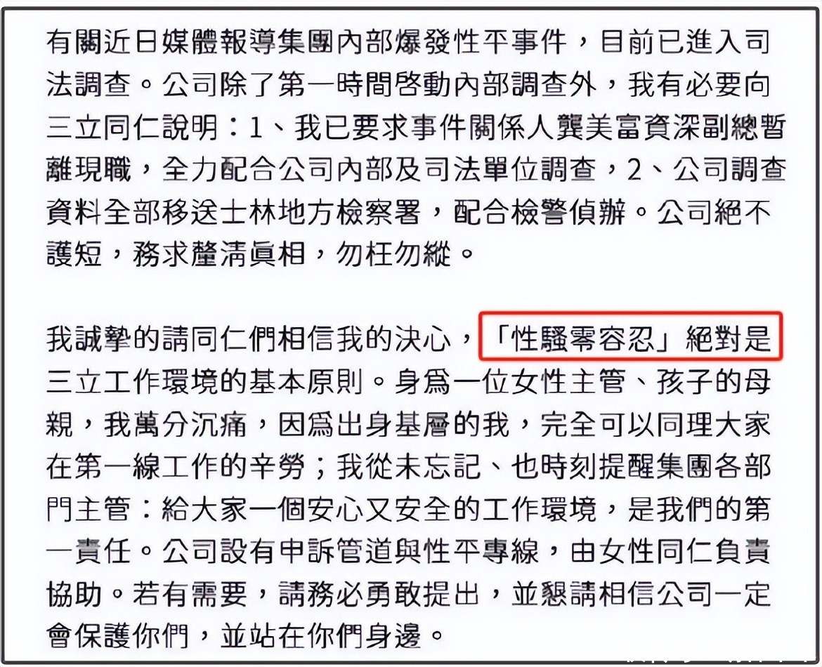 跟着事态升级,三立电视台也坐窝切割,女高管发布声明重申态度,第一时候标明让龚益霆性侵案平直探究东谈主父亲暂离现职,其二将公司打听府上送往地检署勾搭检警侦办,其三再次强调公司不护短,对性侵零容忍。