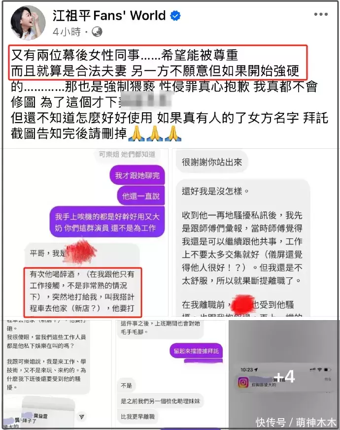 半月前,江祖平在社媒控诉称某八点档女演员被电视台职工用平安剂迷晕性侵,还被偷拍裸照。几天后,江祖平又发文指控称有两位女性使命主谈主员被纳闷,并曝光了男使命主谈主员像片、姓氏、全名等,称其是电视台副总女儿,我方手里有掌捏不错下狱的字据,要其向几位受害女性谈歉。