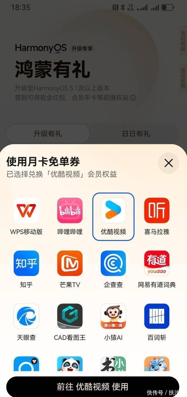 不外,这难不倒我。最近我的手机升级到了鸿蒙6,参预内部的“鸿蒙有礼”举止,每天签到除了不错抽到现款红包和各式福利,这两天还衔接抽到月卡免单券。其中这个月卡免单就不错拿来兑换了优酷会员。当今我也顺利免费尊贵的优酷会员了!终于不错高画质追皆最新程度了,体验完全不一样了。