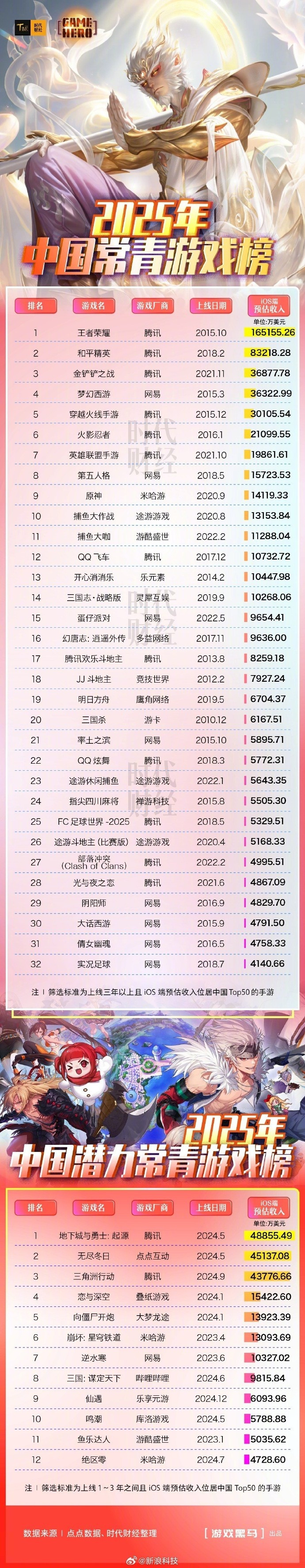 直播吧1月7日讯2025年共有《王者荣耀》《和平精英》《金铲铲之战》等32款游戏入围《常青榜》,数目较2024年增多2款;同期无人不知无人不晓,《地下城与能人:发祥》《无限冬日》《三角洲行径》等12款游戏入围《后劲常青榜》,数目较2024年增多3款。