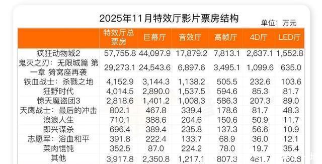 更关节的是票房结构的颠覆:2024年殊效厅靠2.7%的场次赚了7.2%的票房,《沙丘2》殊效厅票房占比超4成;本年11月《苟且动物城2》殊效厅票房占比55.1%。 泛泛厅也曾养不活影院了,殊效厅不是“加分项”,是“生涯项”——这等于行业集体押注殊效厅的底层逻辑。