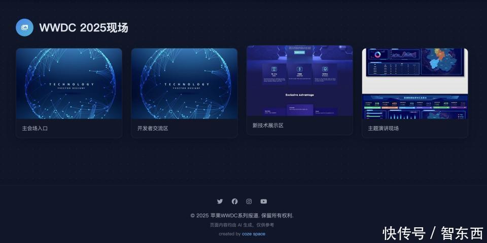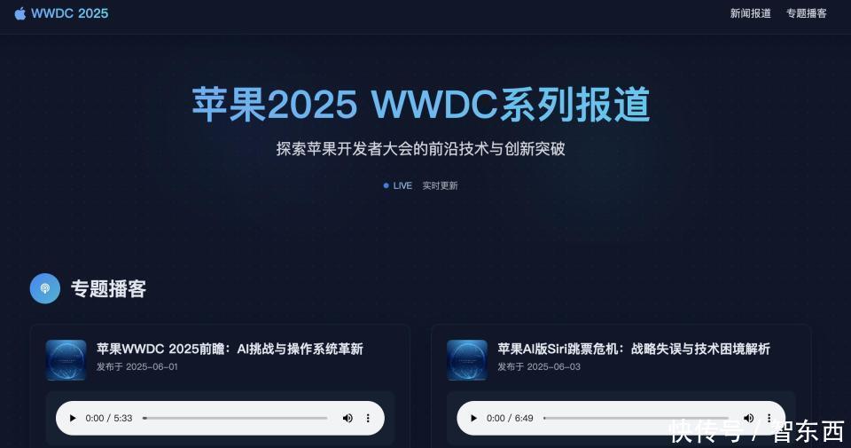 教唆词:将两个贯穿的实验差异生成两则播客,并镶嵌到主题为“苹果2025WWDC系列报谈”的网页里,这个网页需要你帮我生成,作风是深蓝色带有光点的科技风。