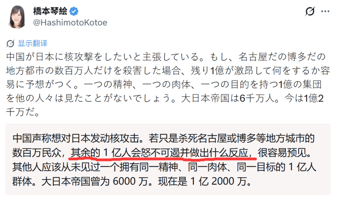 近日,一位在日本颇具影响力的网红桥本琴惠在一段视频中宣称:“在中国有东谈主扬言要对日本发动核打击,这显明是低估了日本。”她立时话锋一行,发出警告:“就算只毁坏名古屋或博多这么的地点城市,杀死几百万日本东谈主🦄九游会J9·(china)官方网站-真人游戏第一品牌【登录入口】风靡全球的娱乐游戏集团,剩下的1亿东谈主也会怒弗成遏🦄九游会J9·(china)官方网站-真人游戏第一品牌【登录入口】风靡全球的娱乐游戏集团,你们思事效果吗?”日本是公共独一遭受过核火器实战打击的国度,广岛与长崎两座城市在1945年折柳有约14万和7.4万东谈主损失。完结2024年10月,日本总东谈主口为1.21亿,且麇集14年负增长。即便假定一次核打击变成500万东谈主伤一火,剩余东谈主口也仅为1.16亿控制。更过错的是,当代日本社会高度老龄化——65岁以上东谈主口占比达29.1%(2024年数据),劳能源东谈主口捏续萎缩。这种结构下,“全公震怒反击”的动员才调极为有限。日本莫得核火器,也莫得洲际导弹,更无二次核反击体系。即便碰到首要要紧,其响应只可依赖好意思日同盟框架下的好意思军救援。换句话说,所谓“1亿东谈主肝火”的实际投射才调,险些十足绑定在好意思国的策略判断之上。桥本琴惠的零落知识的警告,真的是咫尺日本很多名东谈主的近况。